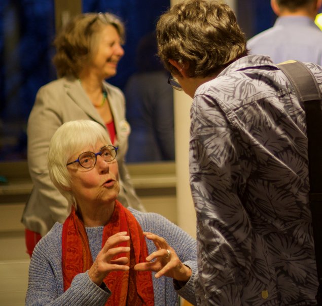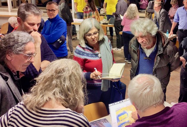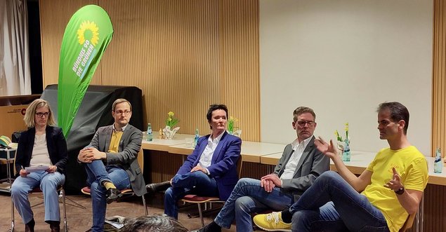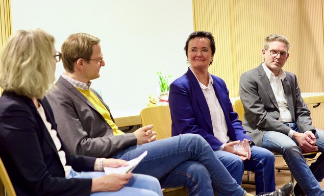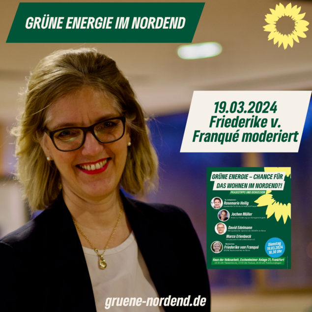 Friederike von Franqué moderiert und diskutiert mit Rosemarie Heilig, David Edelmann, Marco Erlenbach und Jochen Müller Aspekte der Energiewende in der Stadt und im Nordend. Es gibt sehr viele informierte Fragen aus dem Publikum.