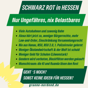 Inhaltlich erwarten die Grünen im Nordend ein starkes Verhandlungsergebnis, das in allen wesentlichen Belangen erkennbar auch grüne Handschrift trägt. Sollte dies nicht gelingen, bleibt für die Stadtteilgruppe nur ein klares „So nicht“.