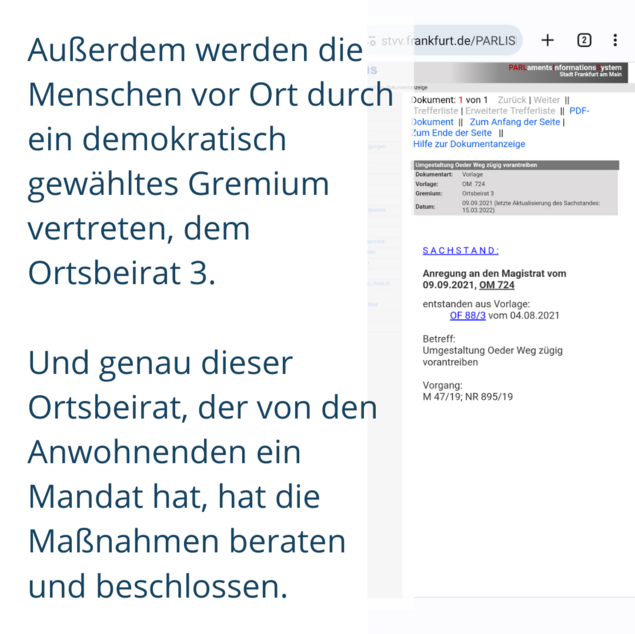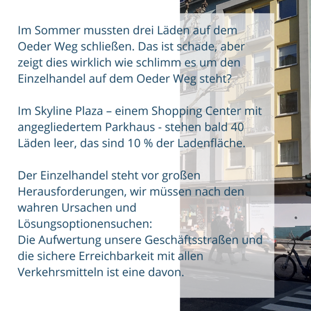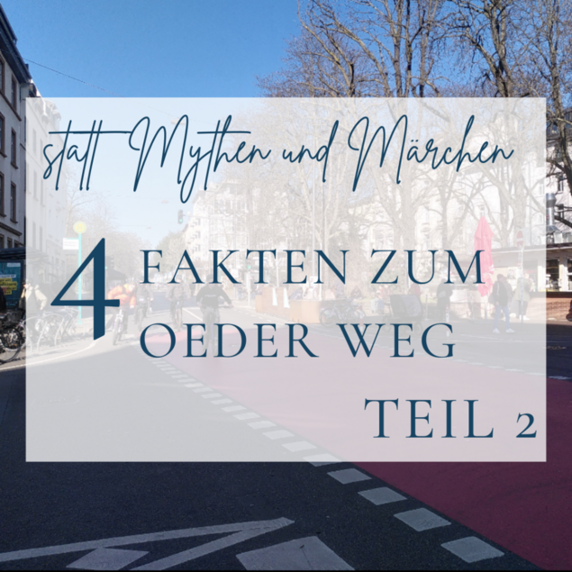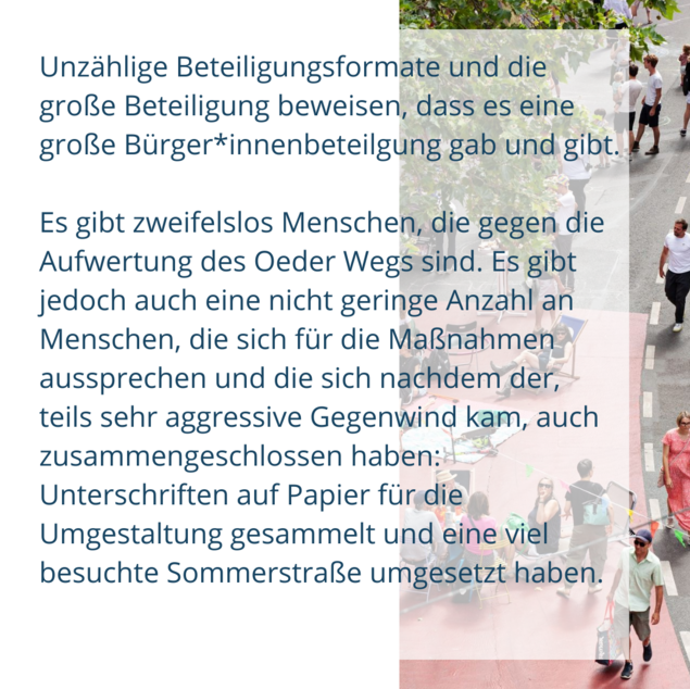 Die Umgestaltung des Oeder Weges in eine fahrradfreundliche Nebenstraße schafft mehr Platz für Radfahrende und Fußgänger*innen, reduziert den Durchgangsverkehr und erhöht die Aufenthaltsqualität. Die Sorgen der Gewerbetreibenden und Anwohner*innen müssen jedoch ernst genommen werden. Der Prozess muss daher durch Erhebungen begleitet werden, die nachvollziehbar prüfen, ob die Anpassung der Verkehrsführung zu negativen Folgen führt.