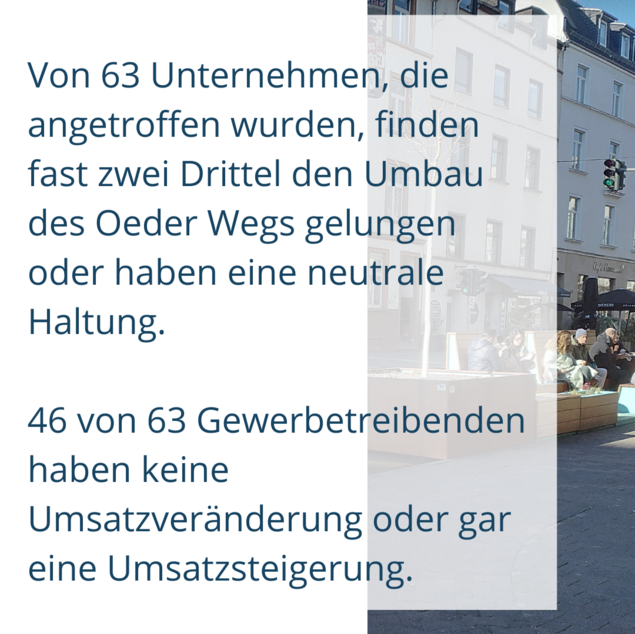 Die Situation der Gewerbetreibenden ist nicht wirklich negativ verändert worden. Die gemessene höhere Verweildauer von Kund*innen im Oeder Weg wird sich wahrscheinlich längerfristig positiv für die Gewerbetreibenden auswirken. Auch im Gewerberegister sind keine negativen Auswirkungen im Oeder Weg im Vergleich zu anderen Geschäftsstraßen festzustellen.