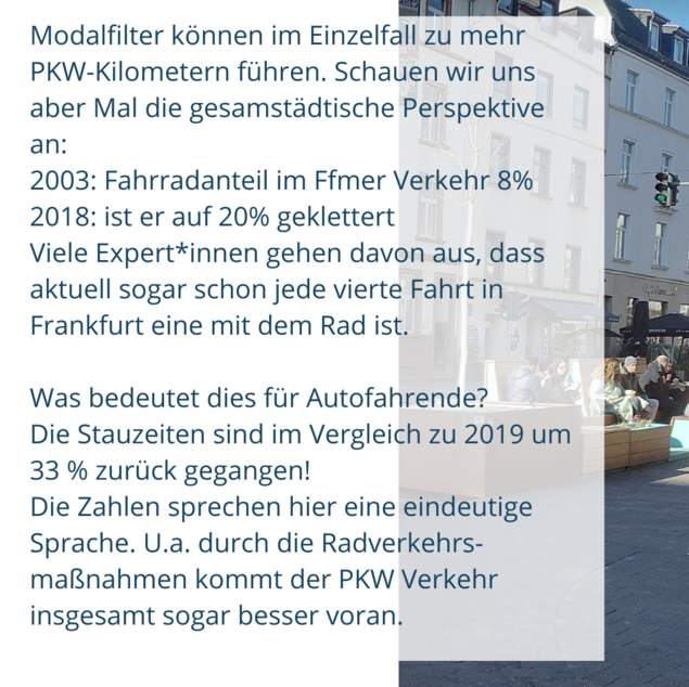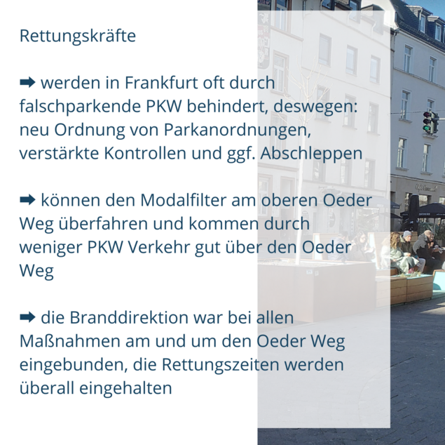 Gleichzeitig ist die Aufenthaltsqualität im Oeder Weg gestiegen – ein tolles Ergebnis für die Anwohner*innen insgesamt. Lediglich im Umfeld des Diagonalfilters in der Cronstettenstraße gibt es Kritik.
