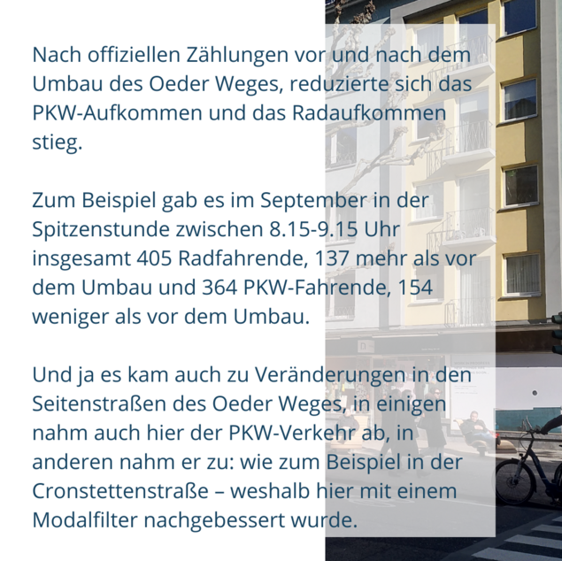 Das Ergebnis spricht ist deutlich – die Umgestaltung des Oeder Weges hat diese wichtige Straße für Radfahrende attraktiver und sicherer gemacht. Die Verkehrszahlen für KfZ haben sich in etwa halbiert, die für Fahrräder in etwa verdoppelt. Beide liegen jetzt auf gleichem Niveau. Trotz der hohen Steigerung sind die Unfallzahlen bei Radfahrenden etwas gesunken.